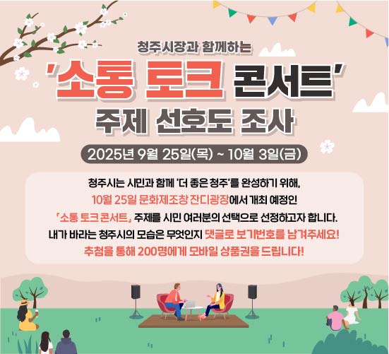 청주시 온라인 여론조사 청주시선 청주 시민의 바람과 목소리를 담는여론수렴 플랫폼, 청주시선입니다. 진행중인 설문 청주시 보건소 건강사업 안내 선호도 조사 D-11 1089명 알립니다 더보기 {{boardEntity.boardDetailTypeCode}} {{boardEntity.boardSubject}} UP {{boardEntity.registDt}} 새로운 소식 그림으로 보는 소식 온라인 여론조사결과를한 장의 그림으로 볼 수 있습니다 그림뉴스 바로가기 영상으로 보는 소식 청주시의 이슈를한 편의 영상에 담았습니다 영상뉴스 바로가기 카드로 보는 소식 청주시선 소식을카드뉴스로 확인할 수 있습니다 카드뉴스 바로가기 시민 정책제안 청주시 상상발전제안 상상이 현실로나의 제안이 정책으로 제안하기 바로가기 ☞바로가기☜